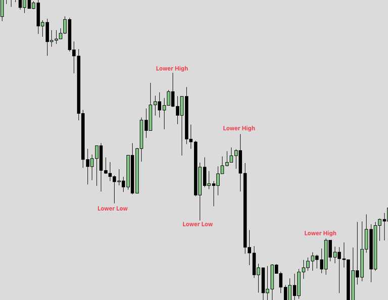 Bearish Structure (Downtrend): Lower Highs (LH) and Lower Lows (LL).